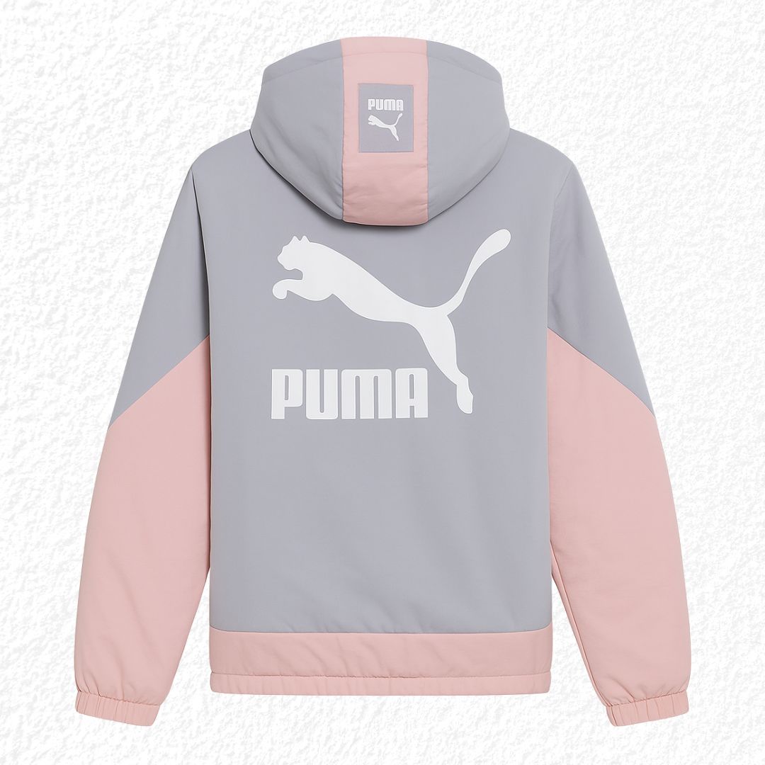 Déjate envolver por la combinación perfecta de moda y comodidad con esta chaqueta Puma color block en tonos pastel gris, rosa y celeste. Diseñada para quienes marcan tendencia con naturalidad, esta pieza destaca por su corte moderno, capucha protectora y un logo Puma de gran tamaño en la parte trasera que no pasará desapercibido.