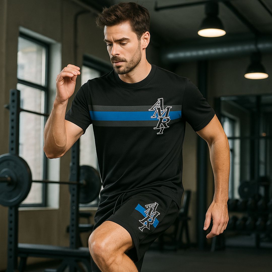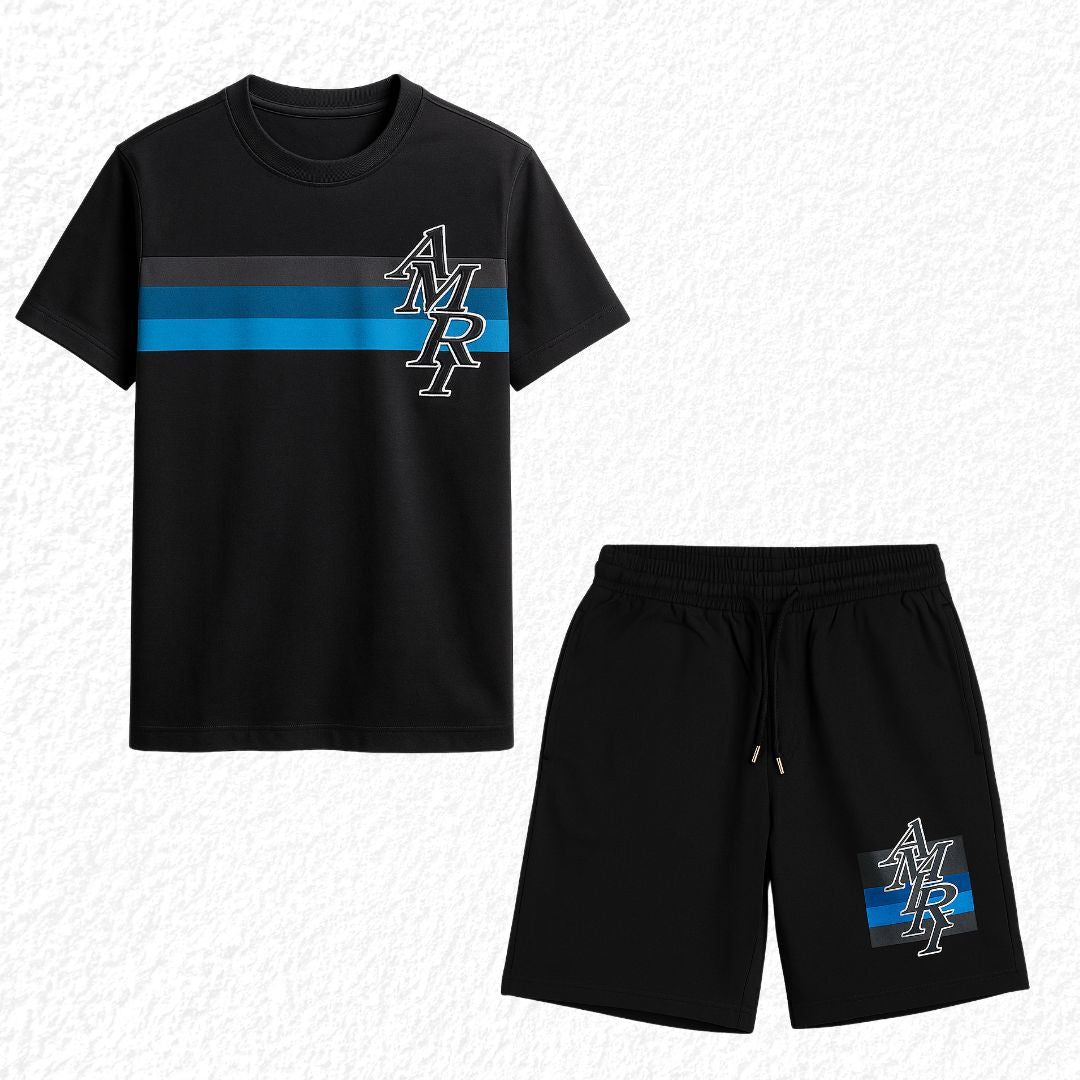 Destaca con un look moderno y sofisticado con este conjunto original de Amiri, compuesto por camiseta y pantaloneta en color negro con franjas contrastantes y logos exclusivos. Un diseño limpio, elegante y con identidad streetwear premium.