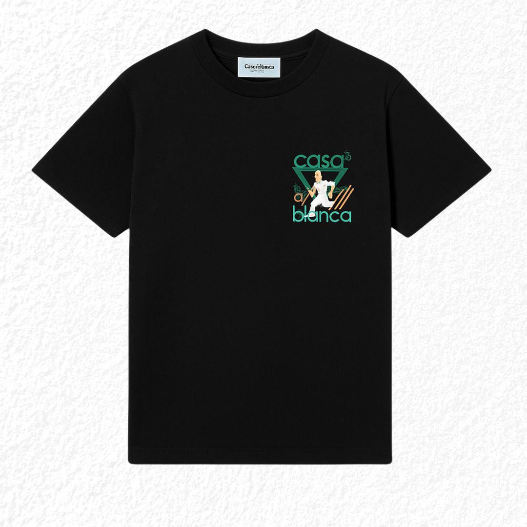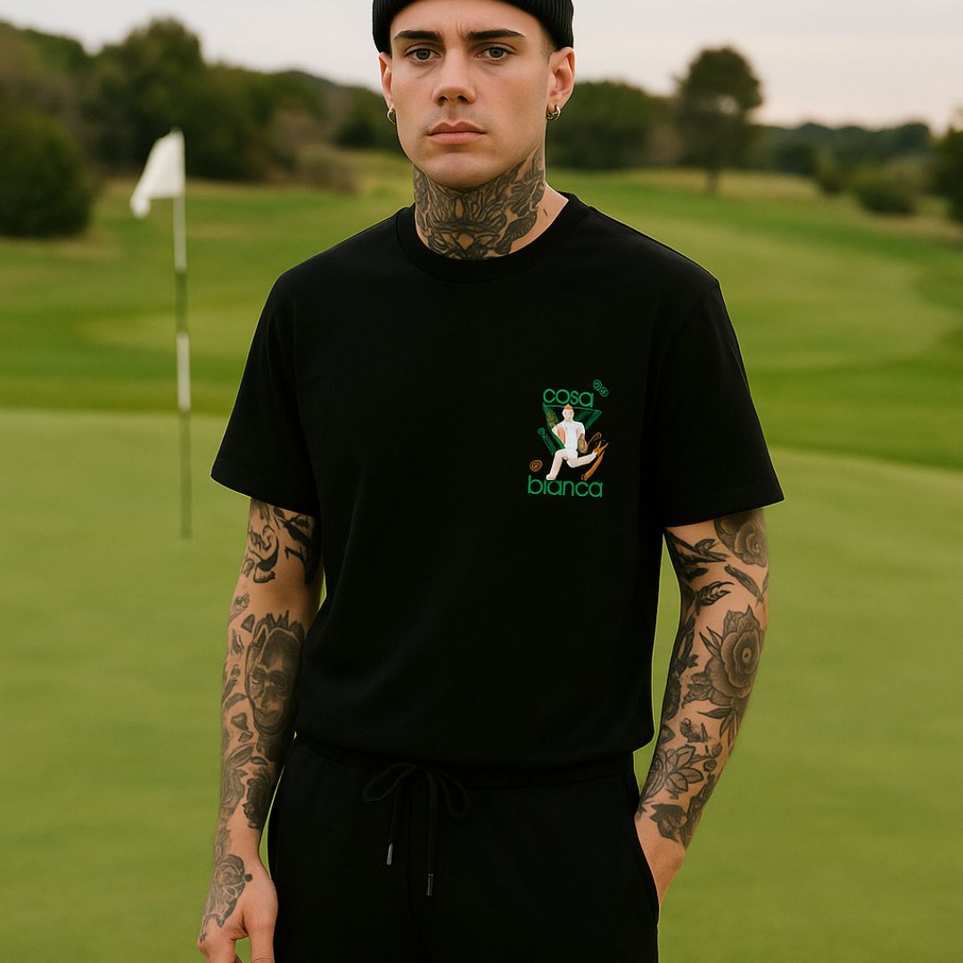 Eleva tu estilo con este exclusivo conjunto de la marca Casablanca, que fusiona elegancia deportiva y moda contemporánea. Compuesto por una camiseta y una pantaloneta en color negro, este set destaca por su llamativo estampado inspirado en el tenis clásico, con detalles gráficos retro en tonos verde, blanco y naranja.
