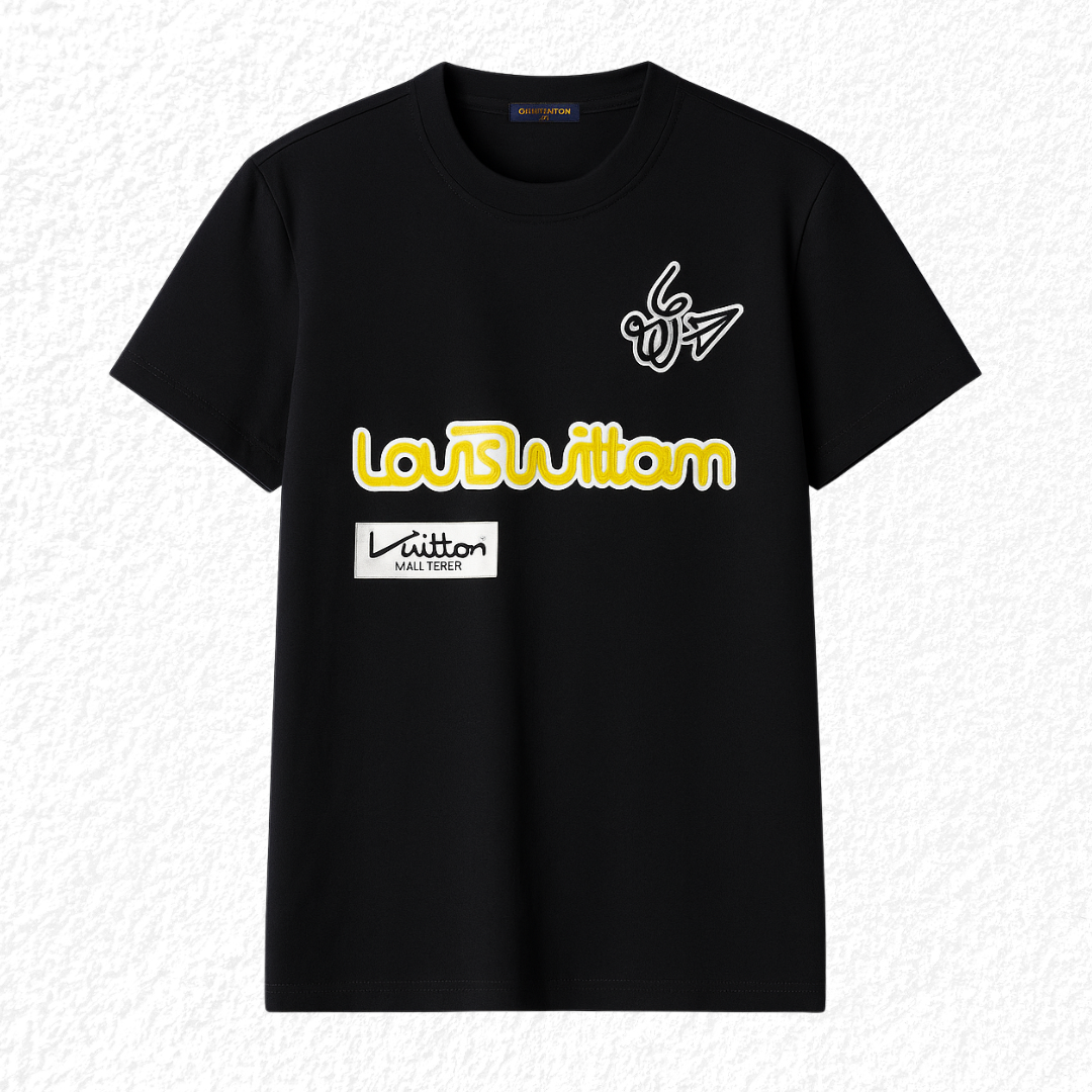 Camiseta de algodón premium con estampados gráficos tipo "LouVuitton" en tonos amarillo y blanco, acompañados de detalles únicos tipo graffiti.